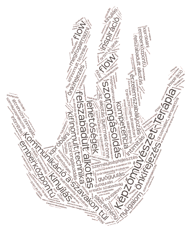 Megkérdeztük a művészetterapeutákat mik lennének azok a szavak amik népszerűsítik a képzőművészetterápiát, baloldali szófelhőben olvashatók a javaslatok